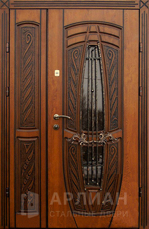 Входная двустворчатая дверь со стеклом и ковкой в загородный дом №14